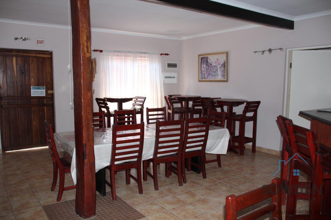 Reception with office and lounge Dining room with a seating capacity of +- 60 persons with indoor braai Kitchen fully fitted with built-in cupboards Scullery/Laundry with Pantry Double garage/storerooms 2 guest toilets Solar geysers Parking spaces for 25 cars on interlocked parking area with electric sliding gate/ intercom High boundary walls with electric security fence